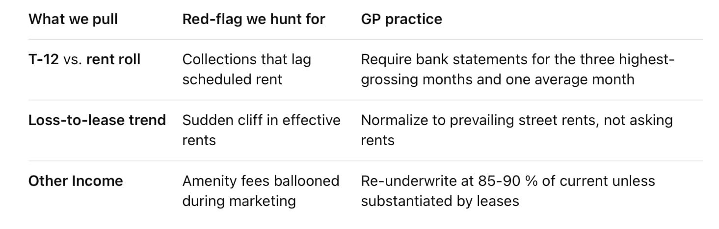 Quarterly reality-check: Each KPI (rent growth, expense drift, CapEx burn, debt-service coverage) is benchmarked against underwriting; deviations ≥ 5 % trigger an update call between you and my team.