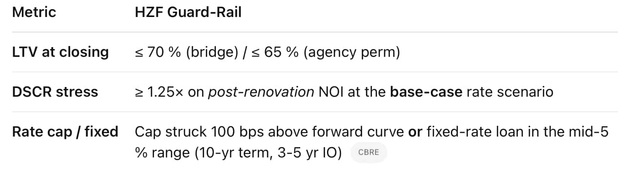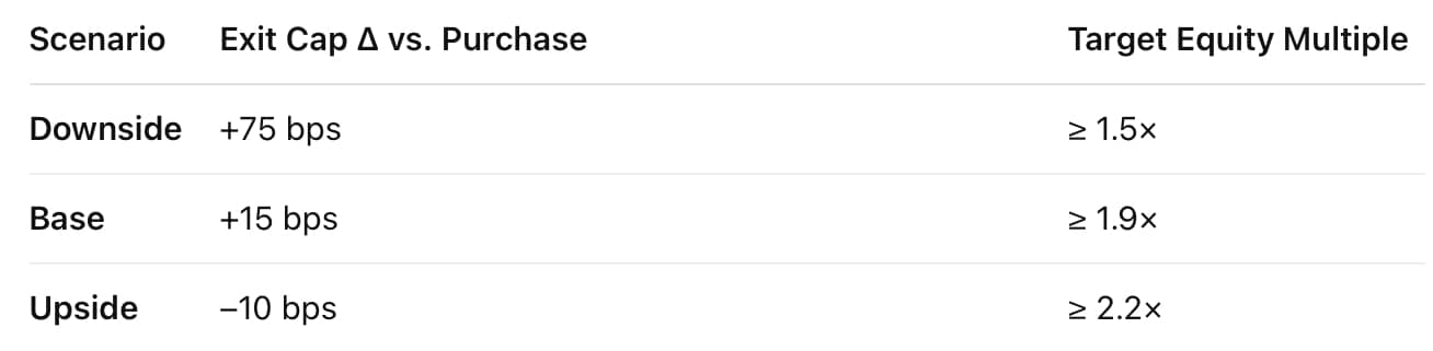 - Cash-flow resiliency via realistic expenses and rate hedging.